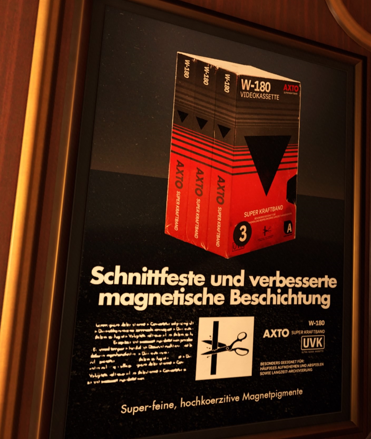 - Poster von AXTO-VHS-Kassetten „Kraftband W-180“ aus Wolfenstein: Youngblood. Screenshot: Pascal Wagner.