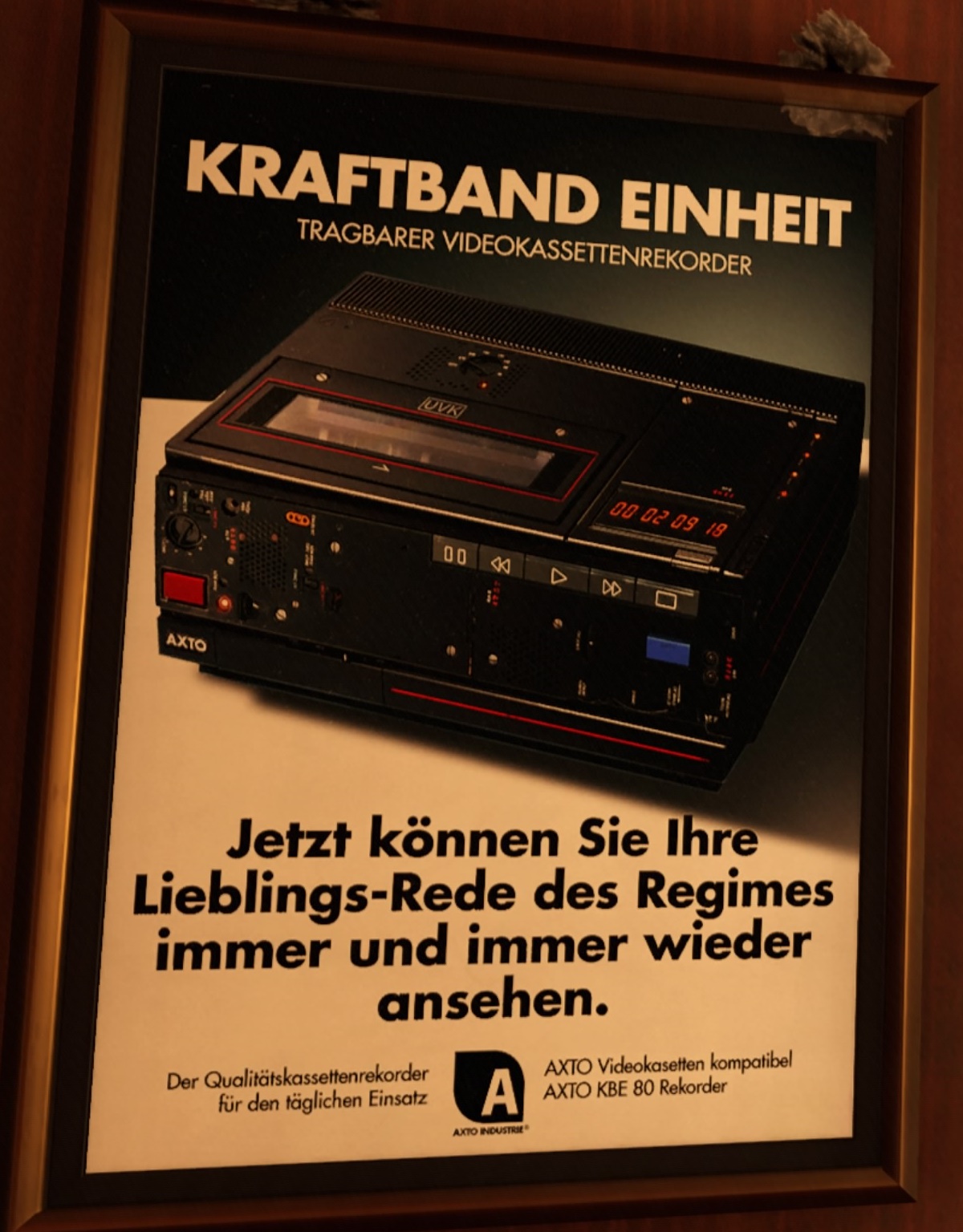 - Poster vom AXTO-VHS-Kassettenrekorder „Kraftband Einheit“ aus Wolfenstein: Youngblood. Screenshot: Pascal Wagner.
