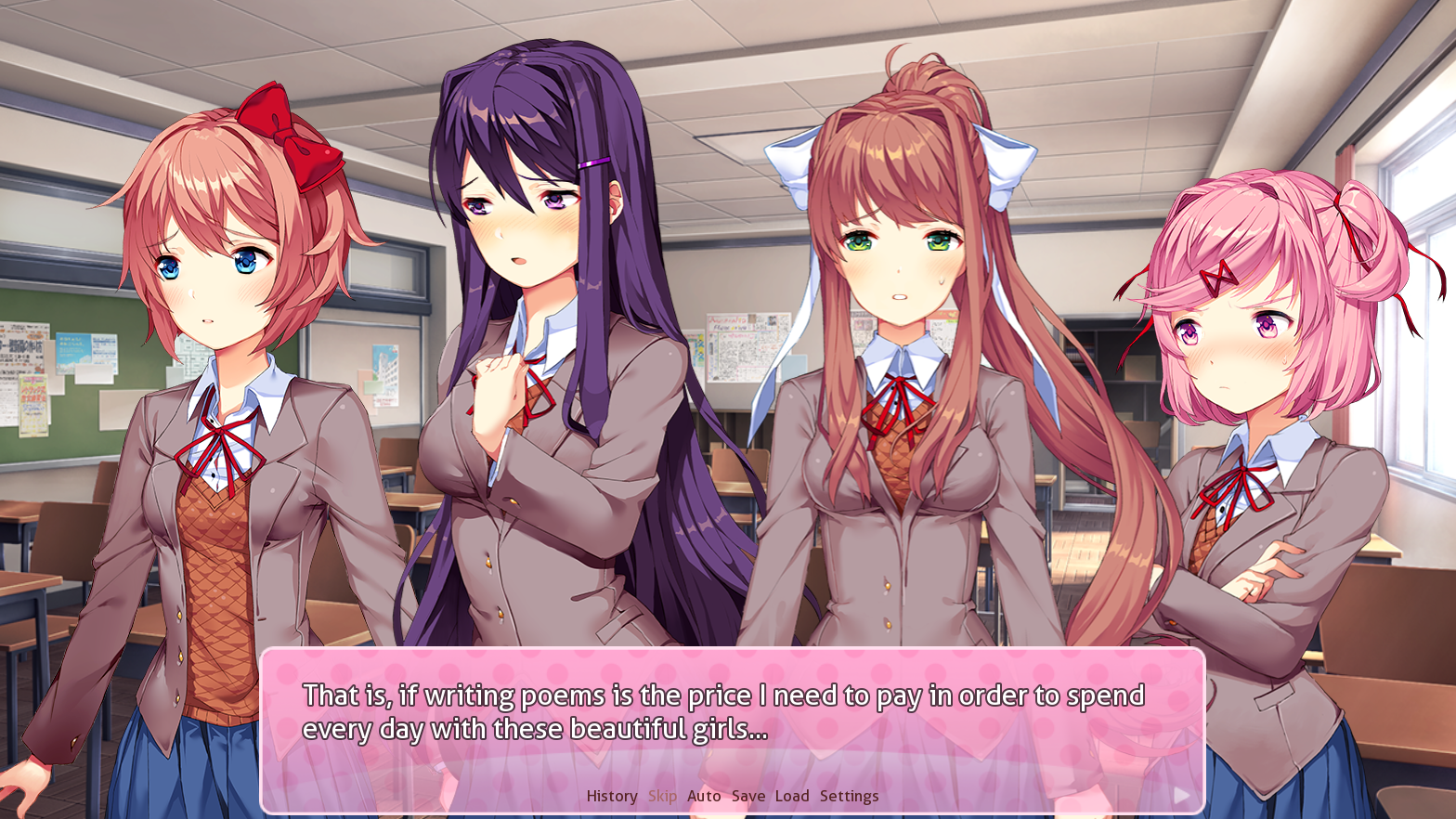 Nach dieser Exposition verläuft das Spiel ähnlich wie man es bei einem Dating-Simulator erwarten würde: Man sucht sich eine der Figuren aus und versucht die Handlung des Spiels so zu beeinflussen, dass sie sich auch für den Protagonisten interessiert. Da alle Mitschülerinnen sich jedoch von vorneherein für den Protagonisten interessieren, werden uns kaum Hürden in den Weg gelegt. Um das Interesse der Figuren zu wecken, müssen wir eine tägliche Aufgabe erledigen: Ein Gedicht verfassen, indem wir aus einer Auswahl von Wörtern die für die Figuren charakteristischen Wörter auswählen. Demnach kann man verschiedene Spielrouten je nach Präferenz einschlagen. Der Spielverlauf ändert sich dahingehend, dass man unterschiedliche Szenen mit den jeweiligen Figuren erleben kann.