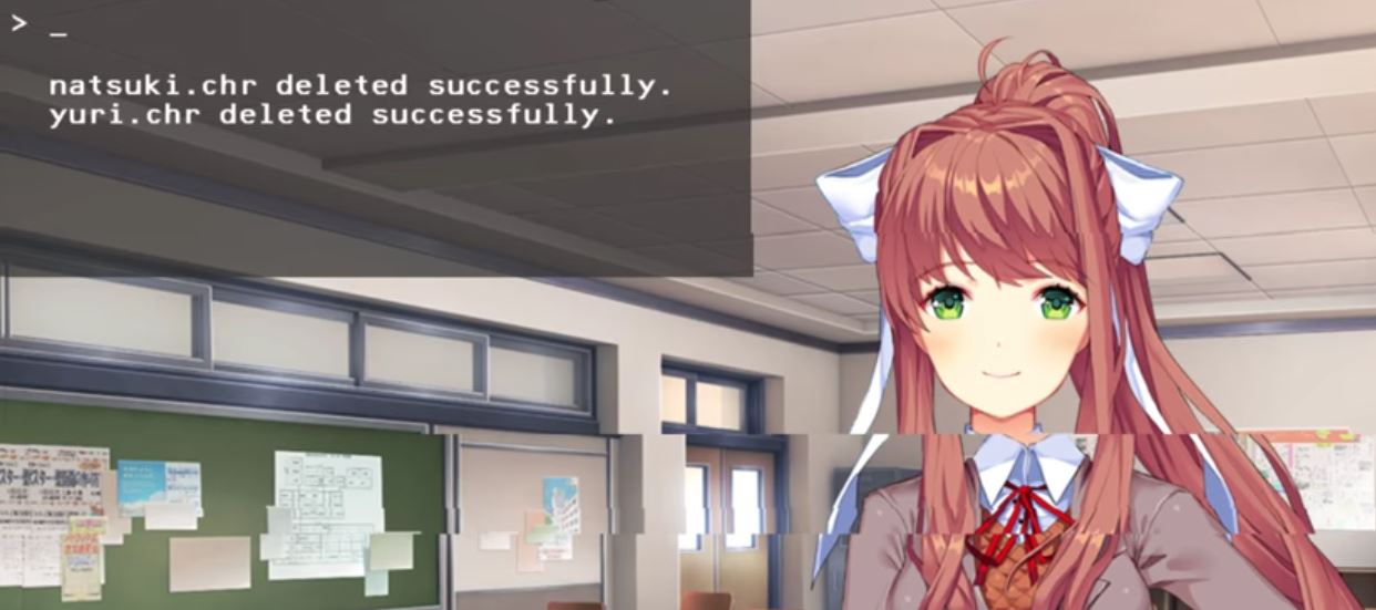 Wenn man das Spiel nun wieder startet, befindet man sich mit Monika in einem Raum. Sie erzählt, dass sie sich darüber bewusst ist, eine Figur in einem Videospiel zu sein und gesteht, dass sie die Handlung und die anderen Figuren manipuliert hat, damit wir uns als Spieler:in – und eben nicht der Protagonist – in sie verlieben. Versuche, das Spiel neu zu starten, misslingen und Textboxen von Monika tauchen auf, dass dies von nun an nicht mehr nötig sei. Wenn man das Spiel beendet und wieder zurückkehrt, kommentiert Monika, dass sie uns vermisst habe. Monika wird so lange über diverse Themen sprechen, bis wir uns entschließen, ihre Datei manuell aus dem Spiel zu entfernen, indem man in den DDLC! Dateiordner geht und „monika.chr“ löscht. Wenn dies getan ist, glitcht das Spiel erneut und Monika beginnt, in Panik zu geraten. Sie sieht sich mit ihrer Ermordung durch ihre große Liebe konfrontiert, kann es gar nicht fassen und zeigt letztlich Reue für ihr Verhalten. Sie stellt die Dateien der anderen Figuren wieder her und entfernt sich selbst aus dem Spiel.