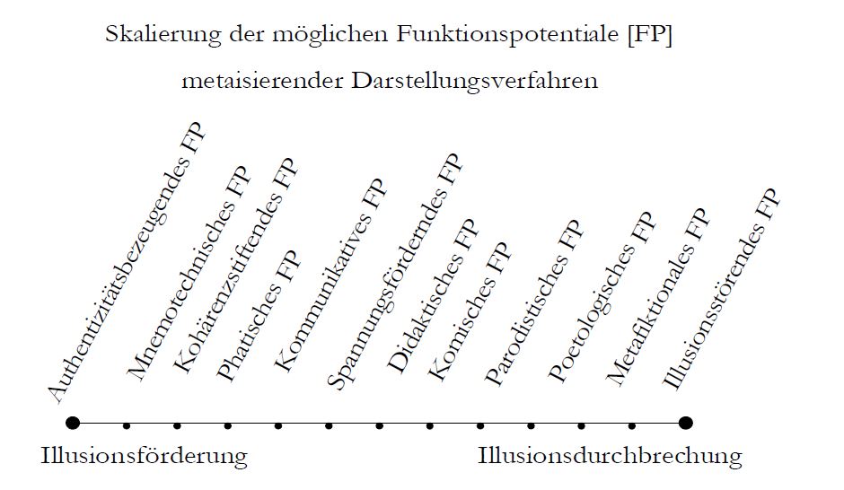Das Spektrum an Meta-Erscheinungsformen ist trotz eingrenzender Kriterien sehr groß und lässt Raum für verschiedene Binnendifferenzierungen.[29] Fotis Jannidis liefert in seinem Beitrag „Metareference in Computer Games“ einige Beispiele für unterschiedliche Formen alleine in Videospielen.[30])Ein wichtiges Anliegen für Hauthal et al. war die Analyse der ambivalenten Funktionspotentiale der Metasierungsformen.[31]) So könne eine illusions-affirmative Metafiktion gleichzeitig eine illusionsgefährdende Wirkung entfalten und in einem skalierenden Wirkungsspektrum festgelegt werden.