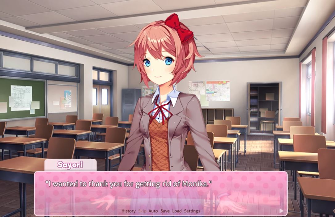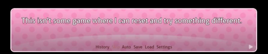 „This isn’t some game where I can reset and try something different.“ Ist die Aussage des Protagonisten, dessen indirekte Aufforderung ich als Spielerin ernst nehme. In einem weiteren Spielverlauf möchte ich Sayori also retten, mich durch die langen Mono- und Dialoge der Visual Novel durchklicken und auf ein positives Ende hoffen.