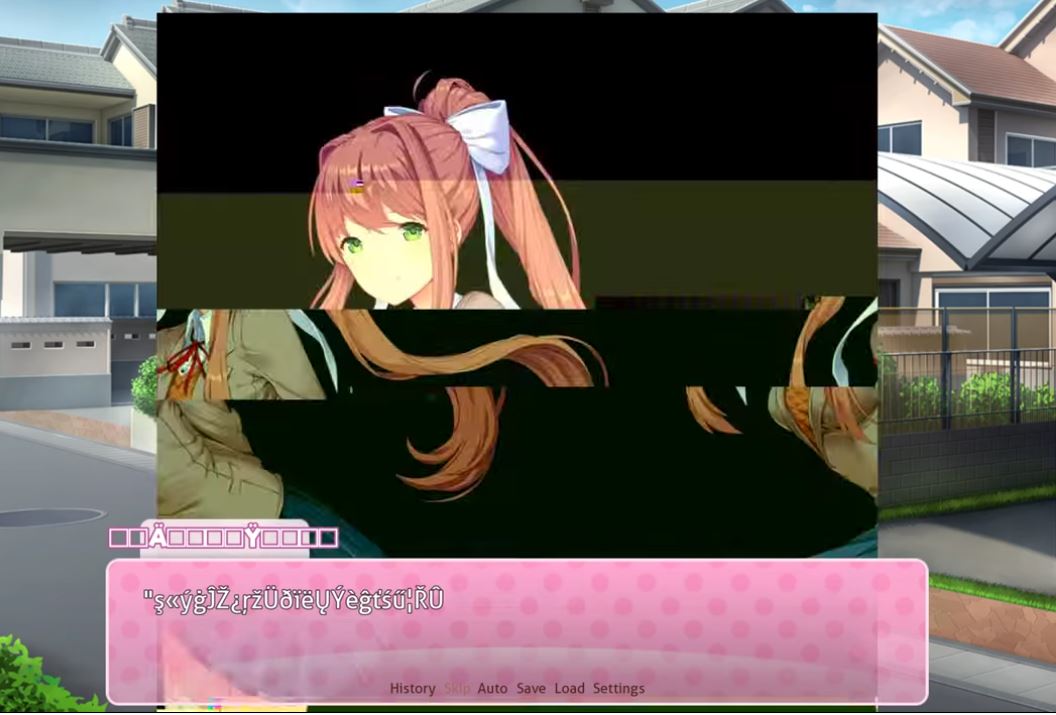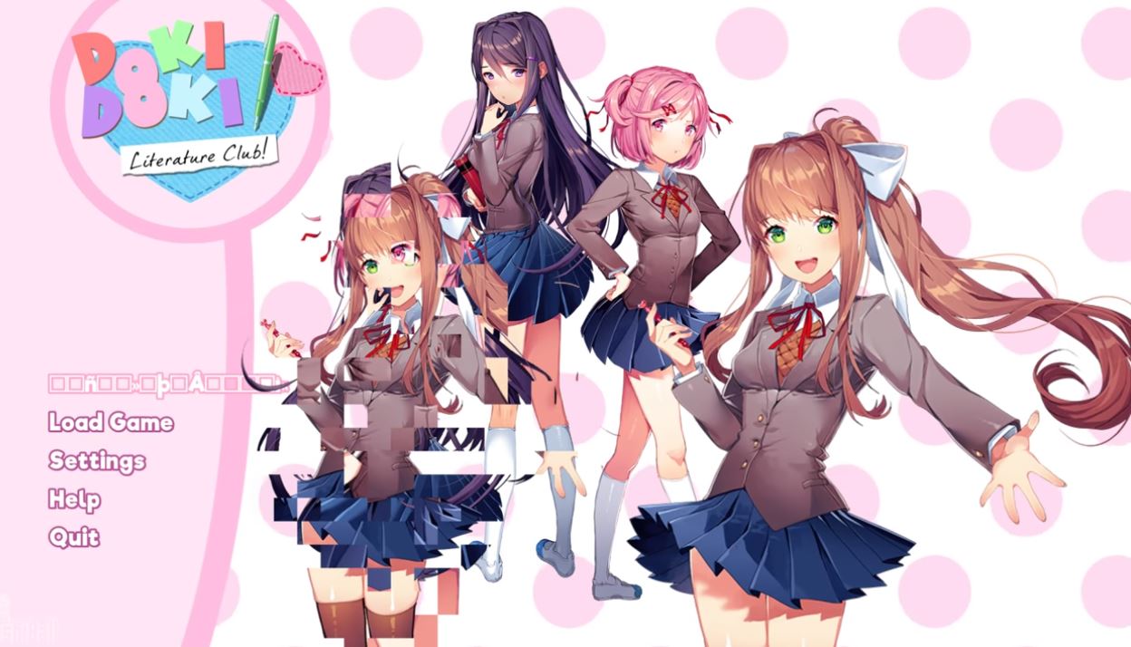 Der vermeintliche Neustart lässt jedoch schnell erahnen, dass ich mich nicht am Ende des Spiels befinde, denn das Spiel hat sich in vielen Aspekten verändert. Der Startbildschirm wird von unidentifizierbaren Schriftzeichen geschmückt. Auch Sayori wird fragmentarisch-verglitcht dargestellt. Ist das Spiel vielleicht verbuggt? Schnell wird mir bewusst, dass ich lediglich am Ende des ersten Aktes von DDLC! angelangt bin und auch die scheinbaren Fehler noch zur Handlung gehören müssen, denn diese schleichen sich in den weiteren Spielverlauf immer wieder ein, indem zum Beispiel Textboxen sowie Spielfiguren verbuggt dargestellt werden. Auf die zuvor gespeicherten Spielstände kann man von nun an nicht mehr zugreifen und die eigentliche Handlung von DDLC! kommt zum Vorschein.