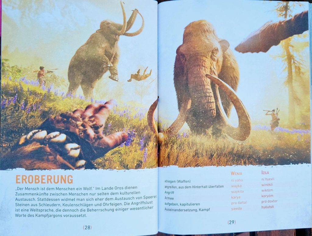Auf diese Weise haben die Linguist*innen für Far Cry Primal drei unterschiedliche Varietäten des Proto-Proto-Indoeuropäischen für das Spiel entwickelt: Wenja und Izila sowie die vereinfachte Wenja-Variante Udam. In einem Beiheft der Special Edition kann man sich durch Informationen zu den drei Völkern blättern. Hier werden ihre kulturellen Hintergründe erklärt, aber auch eine Auswahl an Wörtern und Aussprachehilfen geliefert. Dieser Einblick in die Entwicklungsarbeit lässt die Spielwelt lebendiger erscheinen.