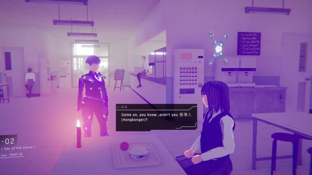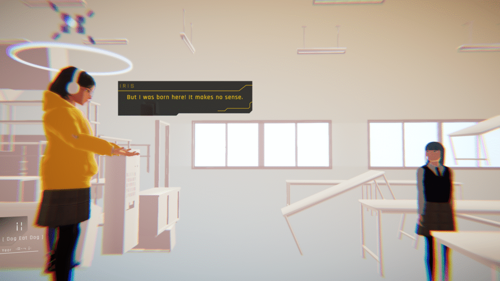 Im Spiel 1000xResist geht es um eine Science Fiction-Dystopie, in der die gesamte Menschheit durch ein außerirdisches Virus der Occupants ausgestorben ist. Alle bis auf eine Person: Iris. Diese klont sich und gründet eine Art Kult, die sie als Allmother anbeten. Innerhalb dieses Szenarios reist man durch ihre früheren Erinnerungen, einige davon noch vor der großen Katastrophe. Diese beinhalten ganz normale Interaktionen mit ihren Eltern, die noch vor Iris Geburt von Hongkong nach Kanada ausgewandert sind, oder Mitschüler*innen. In den Erinnerungen werden einige Probleme klar, die das Leben im neuen Land mit sich bringt. Sehr deutlich wird dies in einer Unterhaltung mit ihrer neuen Mitschülerin Jiao aus Hongkong wirft ihr in einer Szene an den Kopf: “Aren’t you Hongkonger?” und “Oh right, I keep forgetting you don’t speak Mandarin!”