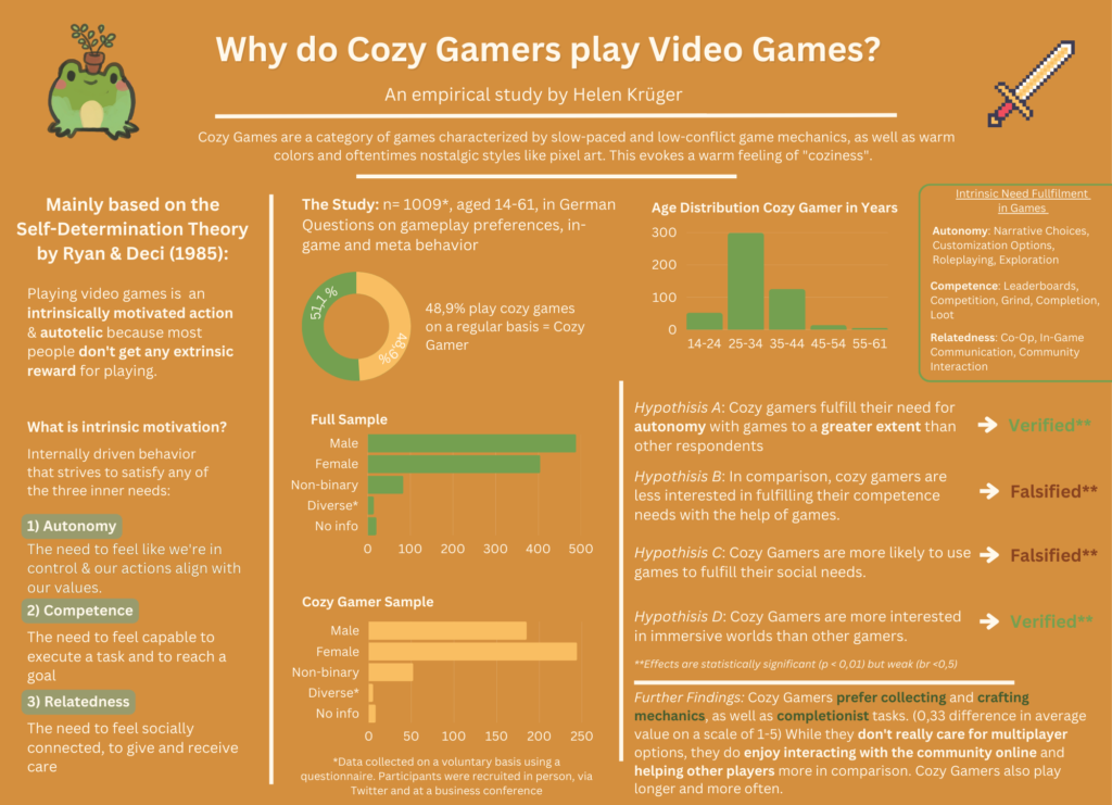 The aim of this study was therefore to find out what motivations players of cozy games have in relation to the medium of video games. To this end, a quantitative study was conducted using a standardized online survey. 1009 participants between the ages of 14 and 61 were asked about their preferences regarding game mechanics and their usage behavior. The questions were based on theories from motivational psychology, primarily the self-determination theory of Deci and Ryan (1985), as well as research on the motivation of video game users based on this theory.